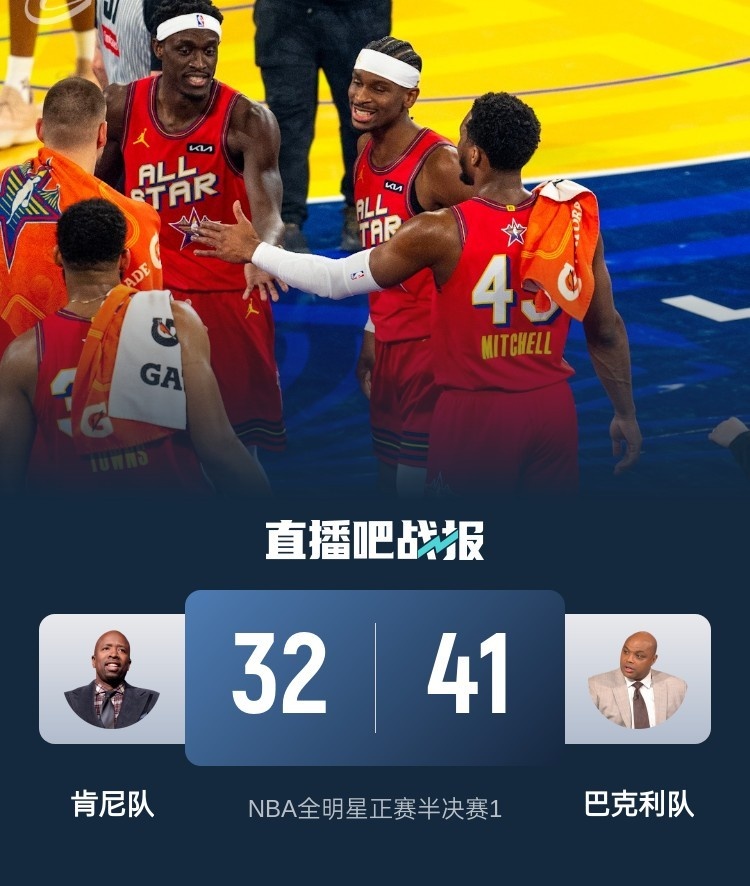 2月17日讯 NBA全明星正赛首场半决赛,肯尼队对阵巴克利队。肯尼队有爱德华兹、布伦森、贾伦-杰克逊、杰伦威、加兰、莫布里、康宁汉姆、希罗;巴克利队有约基奇、特雷-杨、亚历山大、文班亚马、西亚卡姆、申京、唐斯、米切尔。