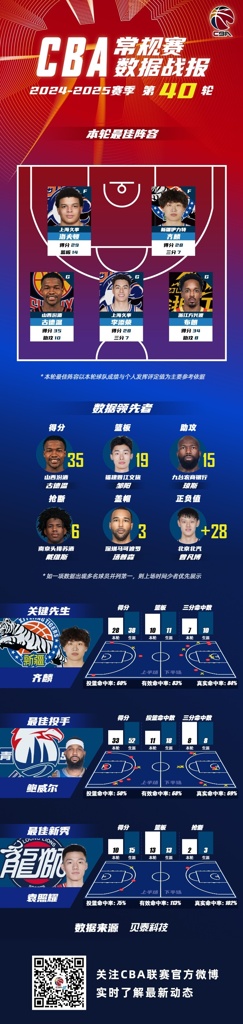2024-2025赛季CBA联赛常规赛第40轮结束较量,来自上海久事大鲨鱼的洛夫顿和李添荣,新疆广汇篮球俱乐部的齐麟,山西汾酒职业篮球俱乐部的古德温和浙江广厦篮球俱乐部的布朗入选CBA联赛常规赛第40轮最佳阵容!