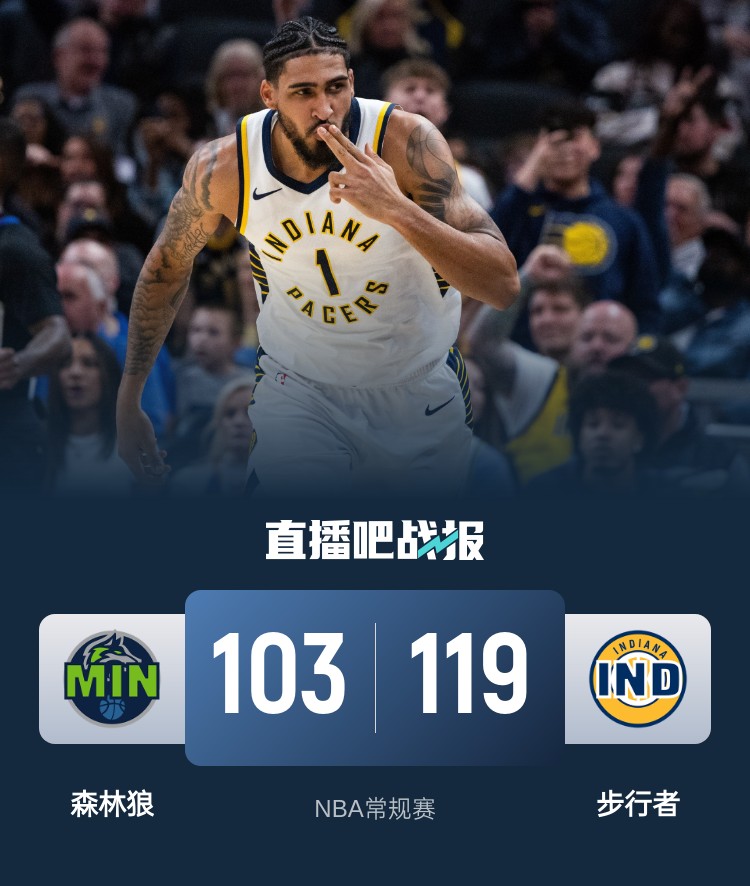 比赛上来,步行者就占据了场上主动并获得领先,不过森林狼始终紧咬比分没有让分差拉开,次节森林狼依旧没有获得反超的机会,步行者一度将分差拉开到两位数,半场结束时森林狼落后6分;下半场回来,步行者的进攻彻底打开,单节轰出41分,托平节末连进三记三分球,分差也被扩大到二十分以上,末节森林狼连拿九分缩小分差,不过步行者及时调整后分差一直保持在十分以上,最终步行者轻取森林狼迎来五连胜。