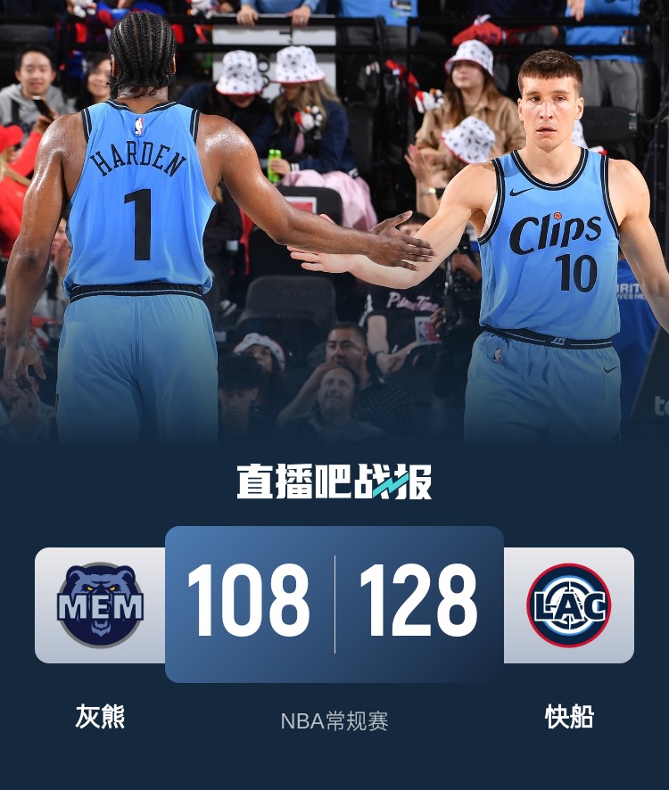 比赛开始,邓恩连中三分帮助球队打出11-3的开局,灰熊内外开花迅速反超,双方陷入缠斗,比分始终紧咬,哈登得分助攻一肩挑,灰熊多点开花强势回应,次节肯纳德连中三分,灰熊一度获得8分优势,哈登连中三分率队扳平,灰熊冲击内线连连得手,半场战罢快船60-66落后灰熊。易边再战,快船率先发力打出12-3反超比分,哈登内外开花连投带罚单节拿到12分,防守端也切球小贾伦-杰克逊,快船将分差拉开到两位数,末节双方展开对攻,快船多点开花保持场上优势,灰熊苦苦追赶无果。最终,快船128-108击败灰熊,迎来5连胜。