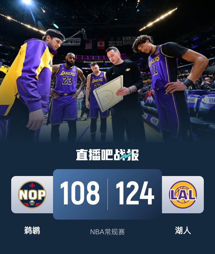 比赛开始,湖人率先发力打出10-3的开局,鹈鹕内外开花迅速反超,阿尔瓦拉多手感火热单节狂砍18分,次节湖人连投带罚逐渐占据场上主动,东契奇回暖内外开花联系拿分,半场战罢湖人62-53领先鹈鹕。易边再战,鹈鹕打出12-5追到2分,东契奇内外开花连投带罚稳住局势,末节詹姆斯和东契奇联手带队扩大优势,鹈鹕大势已去无力回天。最终,湖人124-108击退鹈鹕,主场过关。