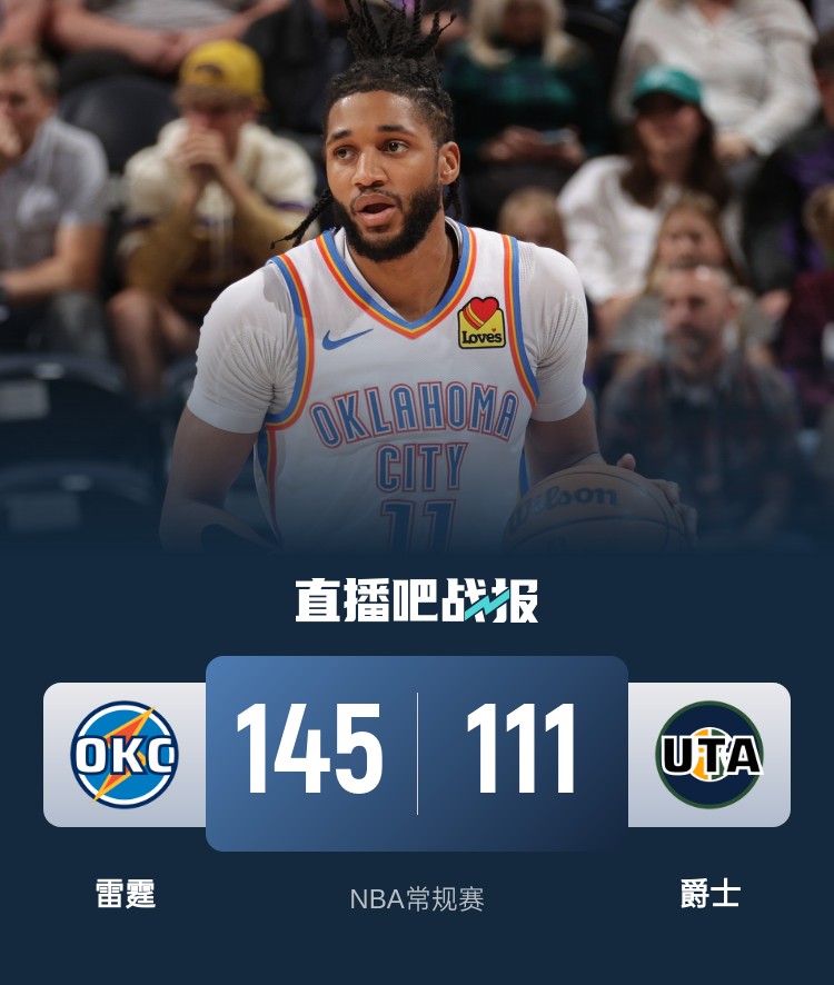 首节开打后雷霆手感滚烫,维金斯里突外投独得14分,乔连中三分续上火力,雷霆下起三分雨早早确立优势,首节结束时雷霆已经领先12分,次节回来,雷霆进攻火力稍稍放缓,维金斯联手乔率队稳扎稳打,半场战罢,雷霆保持15分优势。易边再战后雷霆气势如虹继续扩大分差,末段爵士找回节奏,但雷霆火力不减总能回应,三节结束后雷霆继续领先18分,末节上来,雷霆调兵遣将但攻势不减,爵士难以招架,比赛早早失去悬念,最终雷霆145-111大胜对手。