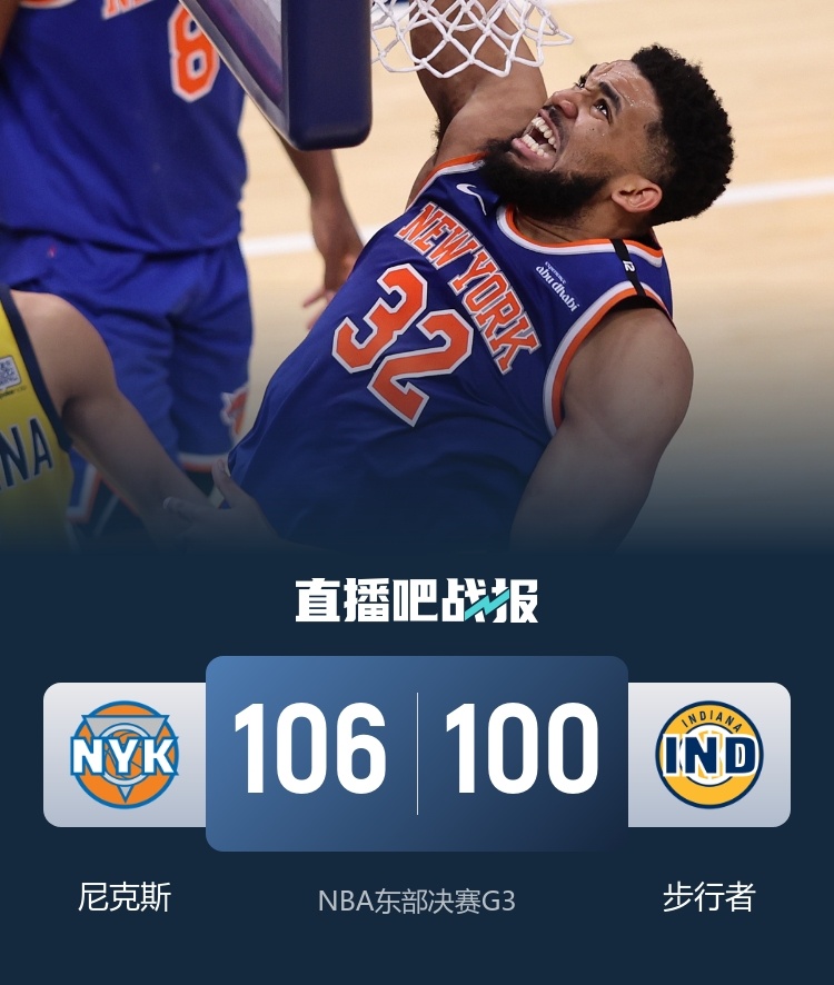 比赛开始,尼克斯将罗宾逊提到首发起到作用,但特纳和谢泼德连续三分回应,随后双方比分持续胶着,麦康纳联手内姆哈德助队首节领先4分,次节唐斯连续攻内线终于取分,但步行者全民皆兵回应小高潮,随后步行者挑战成功后又是一波13-0直接领先到20分,阿努诺比和布里奇斯连续三分半场追到13分。下半场,阿努诺比压哨三分追到差10分,但步行者6-0稳住局势,内史密斯崴脚受伤,麦克布莱德个人轰出7-0追到个位数分差,末节唐斯上来里突外投连砍15分带队直接反超比分,哈利伯顿三分止血,唐斯不讲理三分还能进扩大领先,随后双方连续走上罚球线,比赛进入白热化,布伦森抛投领先2分,特纳和西卡接连关键三分不中,最终尼克斯106-100险胜步行者,大比分扳成1-2。