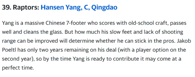 05月31日讯 雅虎体育记者Kevin O'Connor更新了大学生球员退选后的2025年NBA模拟选秀榜单,中国男篮新星、青岛队中锋杨瀚森第39顺位被猛龙选中。
