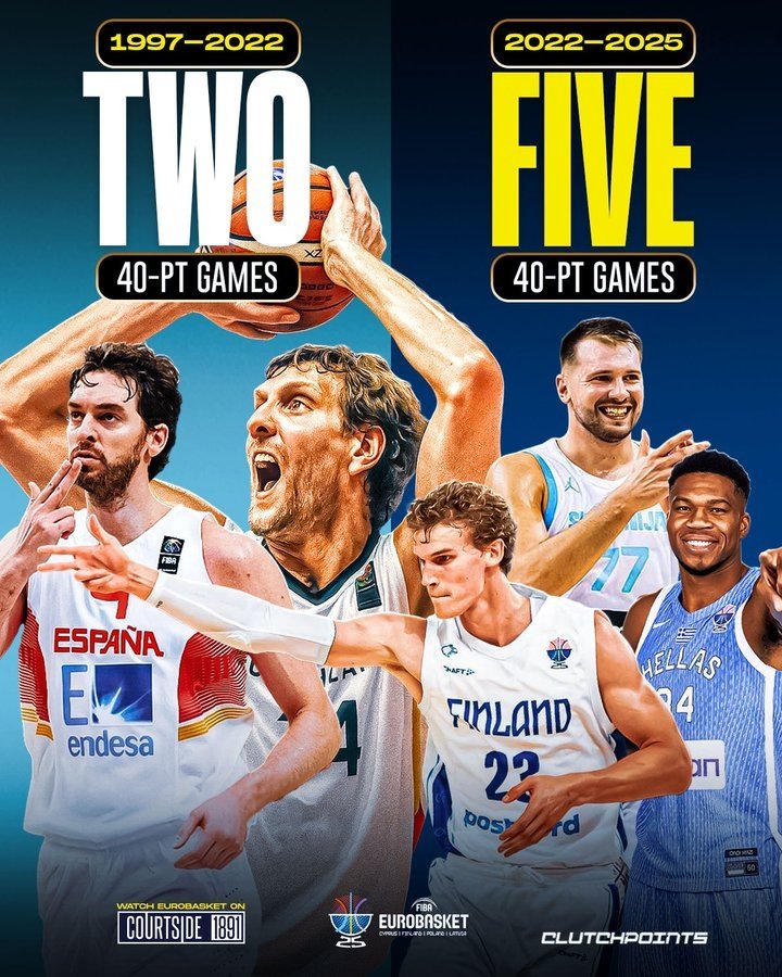 据Clutchpoints统计,1997年到2017年的10届欧锦赛,仅出现过两次40+,23岁的诺维茨基在2001年欧锦赛铜牌战中爆砍43分,35岁的保罗-加索尔在2015年欧锦赛半决赛中砍下40分。最近两届欧锦赛(2022和2025),已经出现5次40+,东契奇2022年对阵法国砍47分,今年对阵意大利砍42分,字母哥2022年对阵乌克兰砍下41分,马尔卡宁2022年对阵克罗地亚砍下43分,今年对阵英国砍43分。