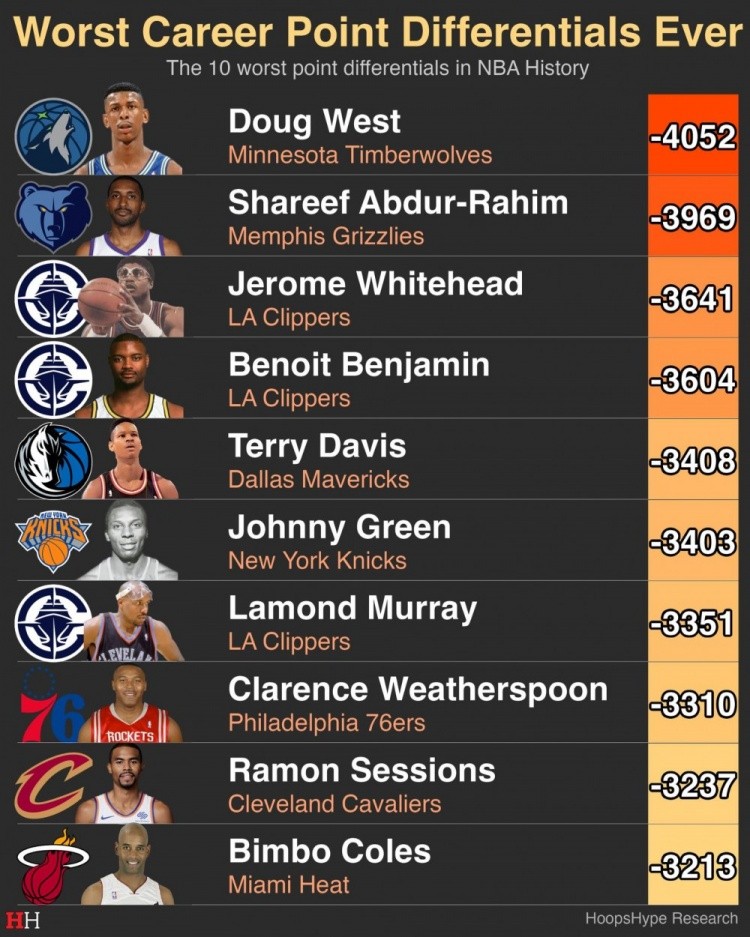 10月10日讯 美媒HoopsHype统计的NBA历史上累计净胜分最差的球员TOP10。HoopsHype也表示这不就代表球员有多糟糕,首先你的能在联盟呆足够长的时间,同时可能又效力的球队战绩比较糟糕。
