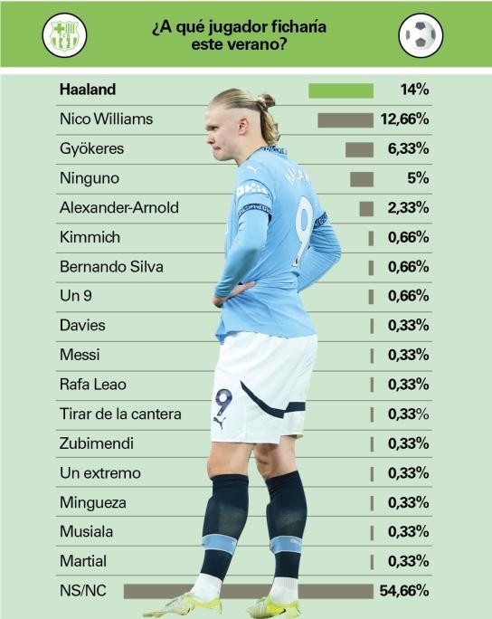 12月27日讯 西班牙《世界体育报》委托Estudi Press对巴萨球迷进行了采访和投票,向他们询问了在冬窗想引进的球员或补强的位置。哈兰德和尼科-威廉姆斯成为最受巴萨球迷期待的引援,而左后卫和中锋则被认为是最需要补强的位置。
