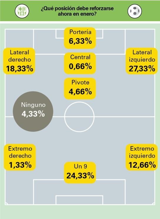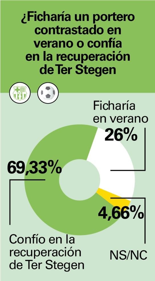 此外,巴萨球迷对队长特尔施特根依然强烈支持。69.33%的受访者表示,他们相信德国门将会恢复到最佳状态,因此无需引进门将。26%的受访者则认为,为了规避风险,巴萨应在明年夏窗签下一名门将来补强。剩下4.66%的受访者没有对门将位置明确表态。