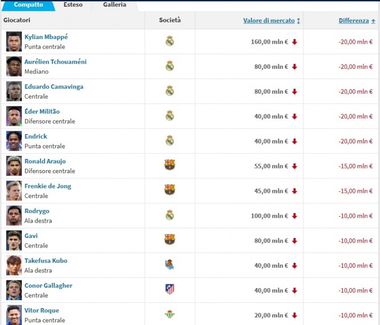 12月27日讯 德转更新西甲球员身价,在跌幅榜中,姆巴佩、琼阿梅尼、卡马文加、米利唐、恩德里克都下跌2000万欧并列第一。