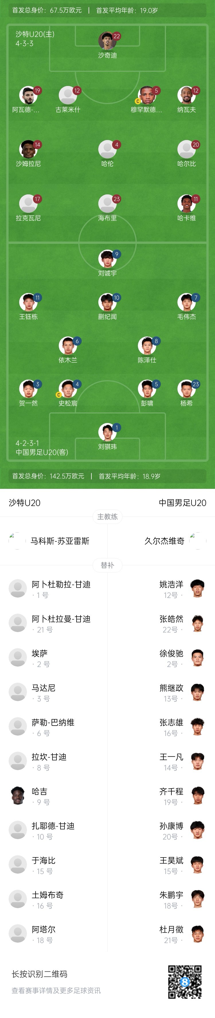 沙特U20首发:22-哈米德-优素福、4-沙特-哈伦、5-穆罕默德-巴尔纳维、12-纳瓦夫-吴莱米什、19-阿瓦德-阿曼、13-巴萨姆-哈扎齐、14-费尔哈赫-沙姆拉尼、20-阿卜杜勒马利克-哈尔比、11-萨阿德-哈卡维、17-侯赛因-拉克瓦尼、23-萨米尔-海巴里