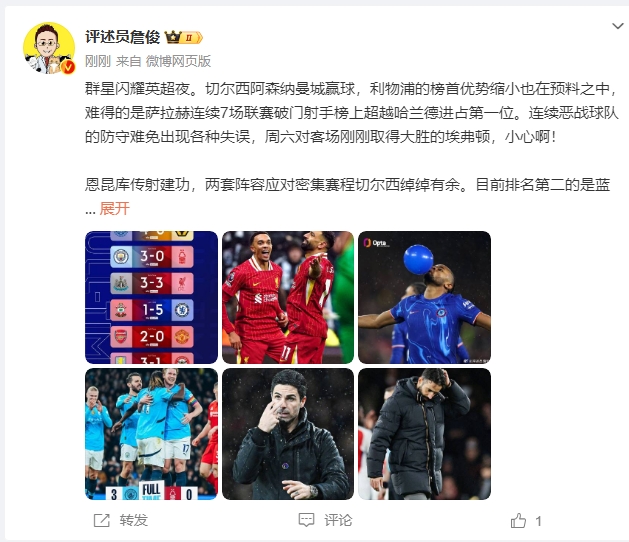 12月05日讯 本轮英超结束多场对决,评述员詹俊发文点评。