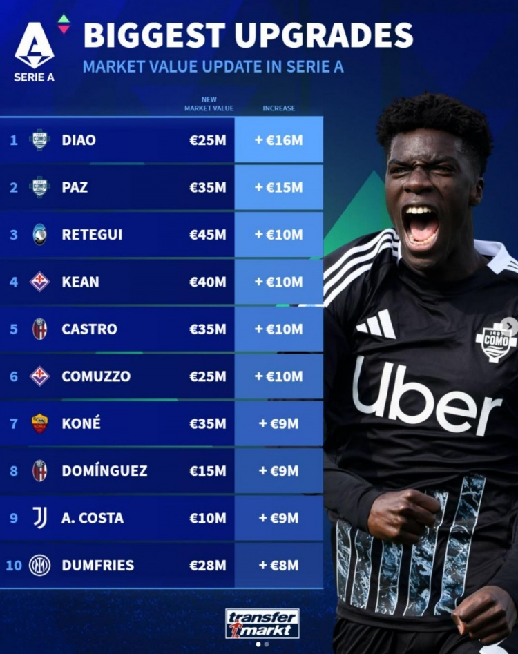 3月30日讯 德转此前更新了意甲球员身价,并盘点了升值最高的10人榜单,其中曼联引援目标小将迪奥居首,以下为具体榜单:
