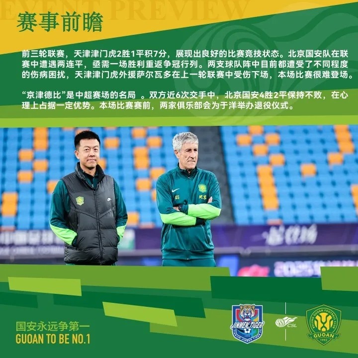 主教练在发布会上表示:“相信明天会是一场很激烈的比赛,现在中超的任何一个队伍都很有竞争力,我们希望打好明天的比赛,用胜利奉献给球迷。我认为明天的比赛会非常激烈,天津是一支非常优秀的队伍,还有主场球迷的加持。明天双方都会拿出最高水平,为球迷们奉献一场精彩的比赛。”