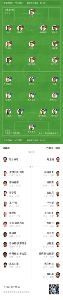 4月30日讯 欧冠半决赛首回合,阿森纳主场迎战巴黎圣日耳曼,赛前首发名单公布。