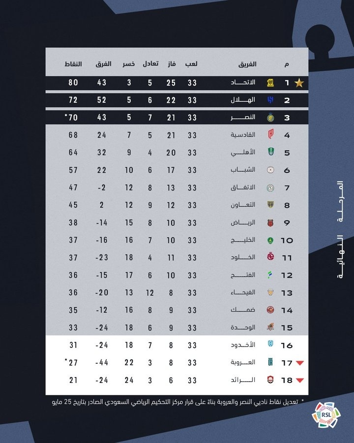 沙特联官方社媒更新积分榜,利雅得胜利70分排名第三,只落后新月2分。沙特联明天凌晨迎来收官战,如果利雅得胜利取胜而新月不胜,胜利将升至第二获得亚冠资格。