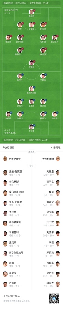 至于印尼队,克鲁伊维特沿用击败巴林的343阵型,首发11人有7名归化球员,三后卫伊泽斯,里多,哈布纳,双后腰佩卢佩西和托姆-海,左翼卫费尔东克都是对巴林队的原班主力。右翼卫首发的是本赛季印尼联赛进球和参与进球最多的本土球员维克里,罗梅尼的两翼也是本土边锋雅各布-萨尤里和坎布瓦亚,这个布阵出乎印尼媒体意料。