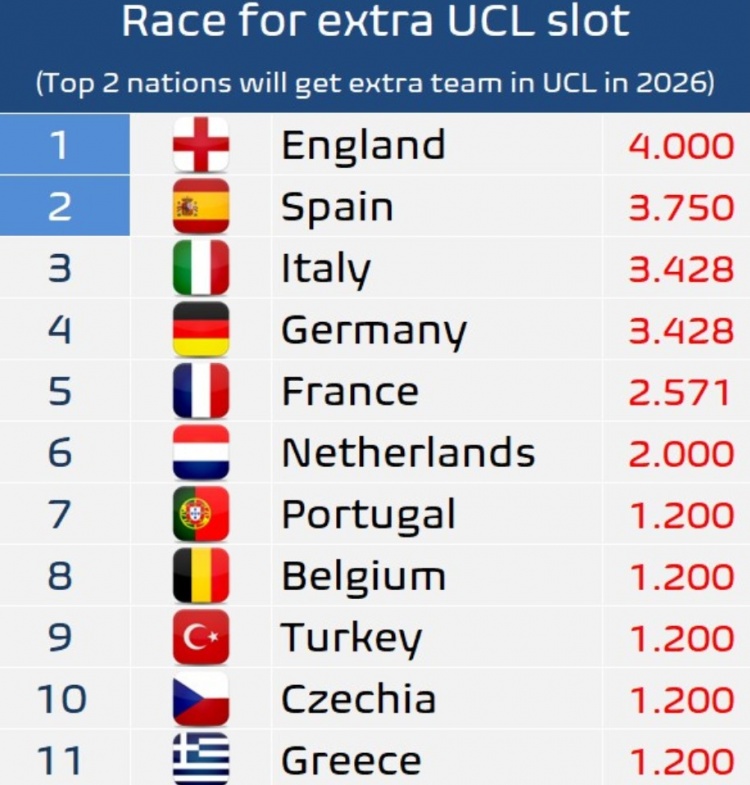 在赛季尚未开始之际,英格兰已经累积了4分的国家系数积分。这主要得益于他们六支参加欧冠的球队每队获得了6个额外积分,总共36分,平均分配给九支球队后,每队获得4分。而西班牙则将以第二名的位置开启新赛季,并同样有望获得一个额外的欧冠席位。