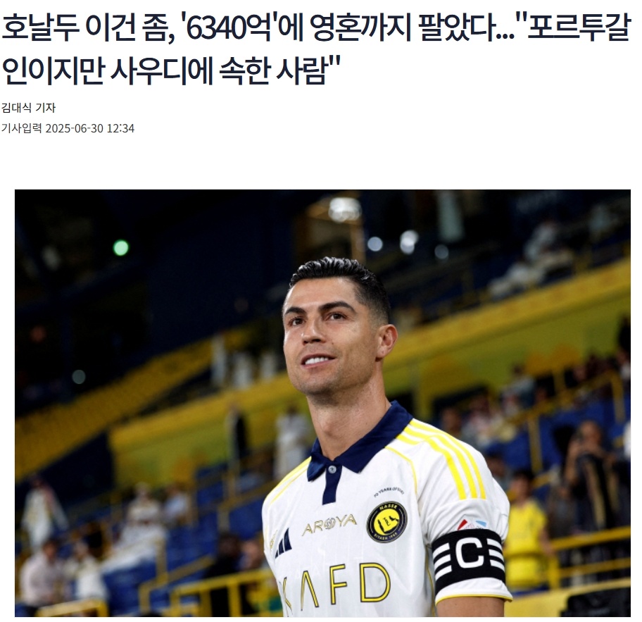 06月30日讯 韩媒Sports Chosun今日撰文批评C罗,标题就言辞激烈地写道:《C罗,这有点太过分了,他为了6340亿韩元出卖自己的灵魂……他是葡萄牙人,却说自己属于沙特》。