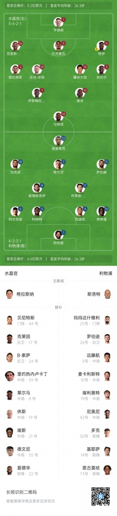 水晶宫首发:1-迪恩-亨德森、2-穆尼奥斯、26-克里斯-理查兹、5-拉克鲁瓦、6-格伊、3-米切尔、20-沃顿、18-镰田大地、10-埃泽、7-伊斯梅拉-萨尔、14-马特塔