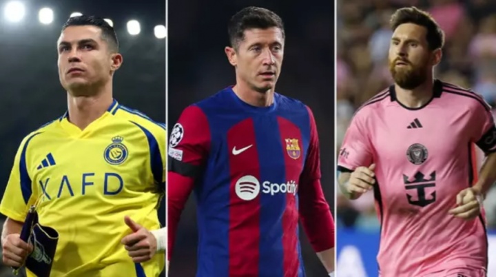 目前在现役球员射手榜上,C罗946球第一,梅西884球第二,莱万700球排在第三。